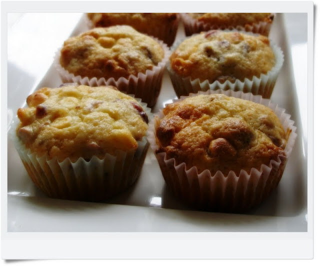 Did some baking today, with ingredients I usually can't buy on the island, dried cranberries and white chocolate chips ( both of which I will be smuggling back with me....SHHHHHH). They came out fantastic. If you take away the cranberries and the white chocolate chips, you are left with a basic muffin recipe . One I just usually add 2 cups of frozen/fresh fruit to (raspberries, blackberries etc). Hope you give them a try. Cranberry Orange White Chocolate Muffins 1/2 cup oil 1 cup sugar 2 large eggs grated peel of 1 orange 1/2 cup orange juice 2 cups flour 2 teaspoons baking powder 1/4 teaspoon salt 1 small bag dried cranberries (soaked in 1/2 cup boiling water 5mins. then drained) 1 bag white chocolate chips Pre-heat oven to 180º/350. Line two muffin pans with paper liners. In a large bowl, mix oil,eggs,sugar, orange juice, and orange peel. Add in flour, baking powder, and salt, stir till combined. Stir in drained cranber...