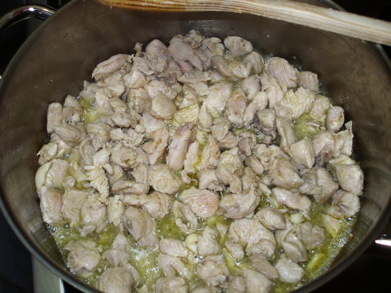 sauté turkey meat, in olive oil (no seasoning), you could also add fresh mushrooms at this point, or canned |